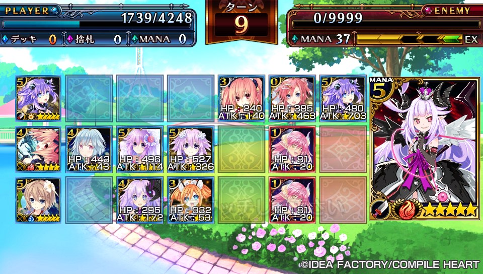 | 6/21(水) | ver.1.02 配信開始 | 時限降臨クエスト 『混沌の女神候補生』実装 | ・フレンド申請やお知らせが届いたときに「!」アイコン表示 ・バトル中、プレイヤー側のMANA保有上限が30に低下 ・「[顕現者]パープルハート」を所持したことのあるプレイヤー全員に「[ジューンブライド]ネプテューヌ」配布 ・一部キャラクターカードのバランス調整 →詳細(ページ内) | ||